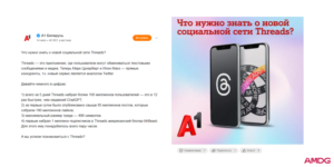 A1 следит за обновлениями digital-мира и держит в курсе своих подписчиков. Так, например, в июле на страницах телеком-оператора в Одноклассниках и в Facebook была опубликована запись с интересными фактами о новой соцсети Threads — аналоге Twitter. Пост не стал самым заметным в сообществе, однако подписчики сообществ не оставили его без внимания. В Одноклассниках публикация набрала 8 “классов” и 7 комментариев, тогда как в Facebook пост понравился 50 пользователям и получил 7 сообщений.
