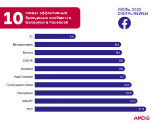 В июле сообщество “Белоруснефть” переместилось с 4-й на 2-ю позицию. Аккаунту “Белиты” также удалось увеличить уровень эффективности. Страница производителя косметики в Facebook поднялась на две строки выше и заняла 3-е место рейтинга. CONTE не удалось закрепиться в ТОП-3, и в середине лета производитель одежды стал 4-м. Mark Formelle в июле опустился сразу на четыре позиции и переместился с 2-й на 6-ю строчку. Ниже расположилось и сообщество МТС. Телеком-оператор опустился с 9-й на 10-ю позицию. Сеть гипермаркетов Green, наоборот, поднялась сразу на 3 ступени выше. Если в июне сообщество занимало 10-ю строчку, то в июле аккаунт стал 7-м в рейтинговой таблице.
