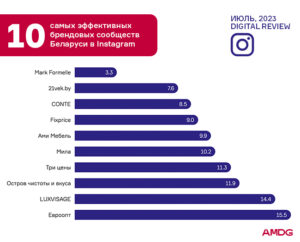 Аккаунту 21vek.by в Instagram удалось подняться с 8-го на 2-е место рейтинговой таблицы. Из-за стремительного роста онлайн-гипермаркета другие участники рейтинга опустились на несколько строчек ниже. Так, например, CONTE пришлось переместиться со 2-й на 3-ю позицию, а Fixprice упал с 3-го на 4-е место. Эффективность “Острова чистоты и вкуса” в этом месяце снизилась. Если в июне компания занимала 4-ю строчку рейтинга, то в июле аккаунт расположился лишь на 8-й позиции. Сеть магазинов “Ами Мебель” поднялась на 3 строчки выше и в исследуемом периоде стала 5-й. На смену бренду Relouis в июле пришел аккаунт LUXVISAGE, который занял 9-е место. Десятым стало сообщество “Евроопт”, которому ранее принадлежала лишь 14-я позиция.