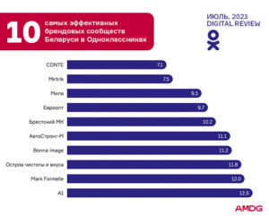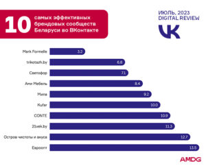 ТОП-3 брендовых сообществ ВКонтакте в июле остался неизменным. Лидирующие позиции занимают Mark Formelle, trikotazh.by и “Светофор”. “Ами Мебель” и “Мила” поменялись местами. Теперь сети мебельных магазинов принадлежит 3-я строчка, а “Мила” располагается на 4-й позиции. В середине лета ТОП-10 рейтинговой таблицы покинул МТС. Если в июне телеком-оператор находился на 9-м месте, то в июле аккаунт занял лишь 11-ю строчку. Место МТС теперь принадлежит “Острову чистоты и вкуса”, который в начале летнего сезона был десятым. Замыкает рейтинг самых эффективных сообществ ВКонтакте аккаунт “Евроопт”.