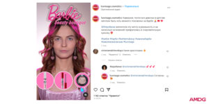 Бренд LUXVISAGE поддался розовой лихорадке. В честь мировой премьеры фильма “Барби” на странице производителя косметики появилось несколько постов в тематике фильма. Так, в одном из роликов о макияже модель представили в виде персонажа компьютерной игры о всемирно известной кукле Барби. Видео не стало самым популярным в сообществе, а количество его оценок не достигло даже средних значений. Если другие июльские ролики нравились примерно 1,3 тысячи пользователей, то публикация в стиле Барби собрала почти 1,2 тысячи лайков. Прокомментировали запись примерно 60 раз. Девушки писали свое мнение о макияже, а модератор сообщества отвечал почти на каждое сообщение под постом.
