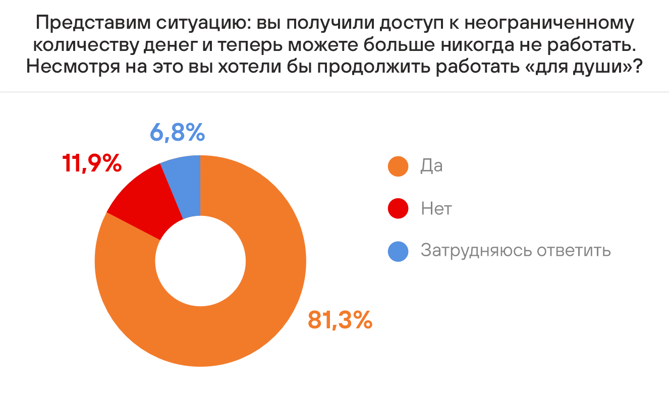 Практически 8 из 10 респондентов продолжили бы работать «для души» даже в случае получения доступа к неограниченному количеству денег. Примечательно, что в этом случае примерно каждый второй специалист хотел бы сменить сферу деятельности и профессию (52,5%).