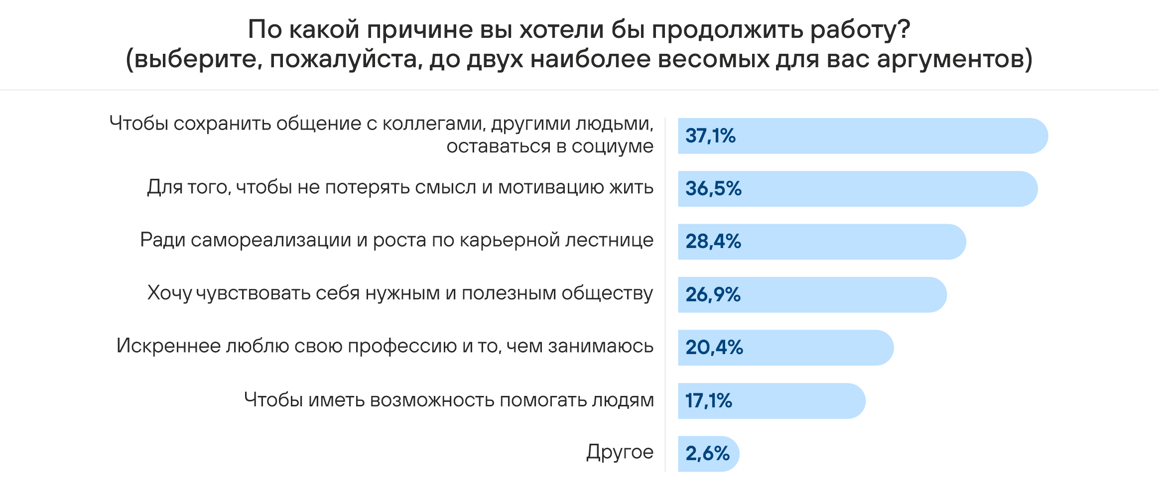 В топ-3 наиболее распространенных причин, по котором опрошенные хотели бы продолжить работу, вошли желание сохранить общение с коллегами и другими людьми, стремление сохранить смысл и мотивацию жизни, а также самореализация и рост по карьерной лестнице.