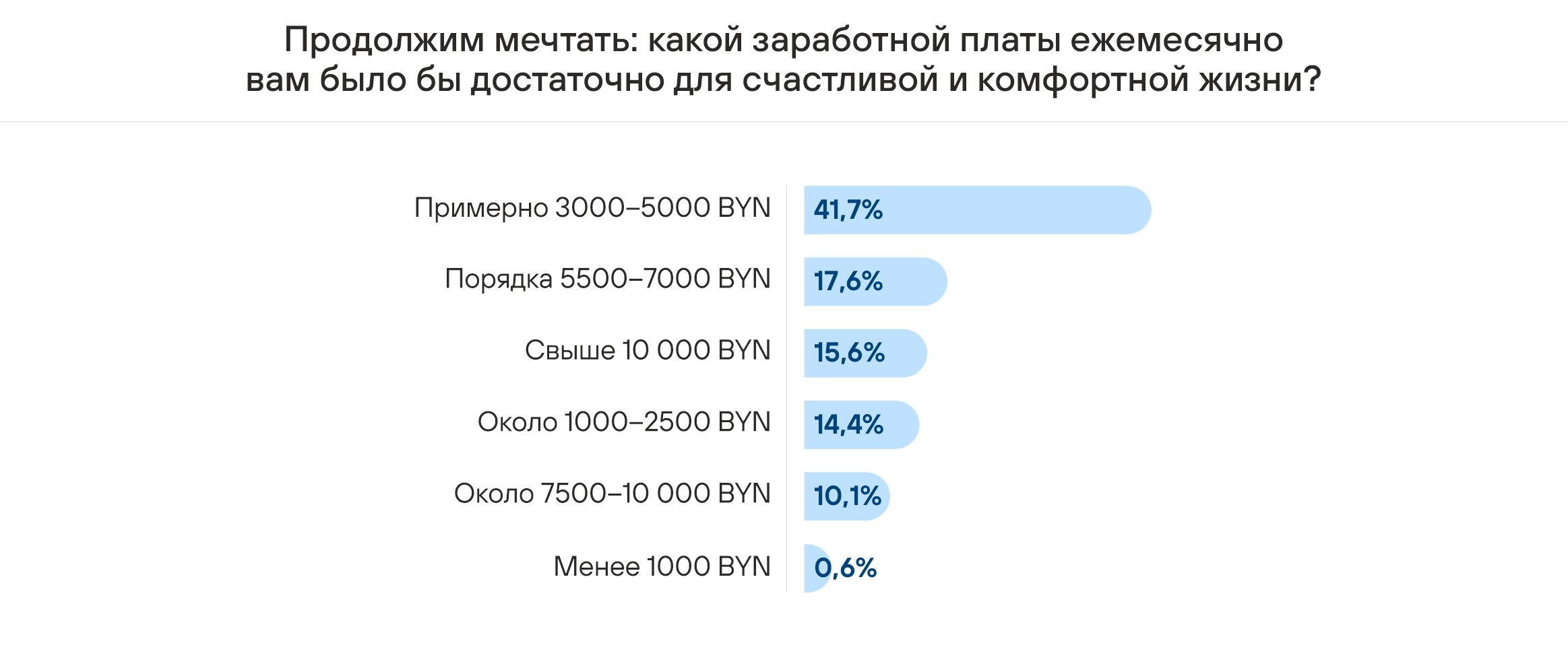 Если говорить о заработных платах, то более 40% указали, что для счастливой и комфортной жизни им хотелось бы иметь заработную плату от 3000 до 5000 белорусских рублей.