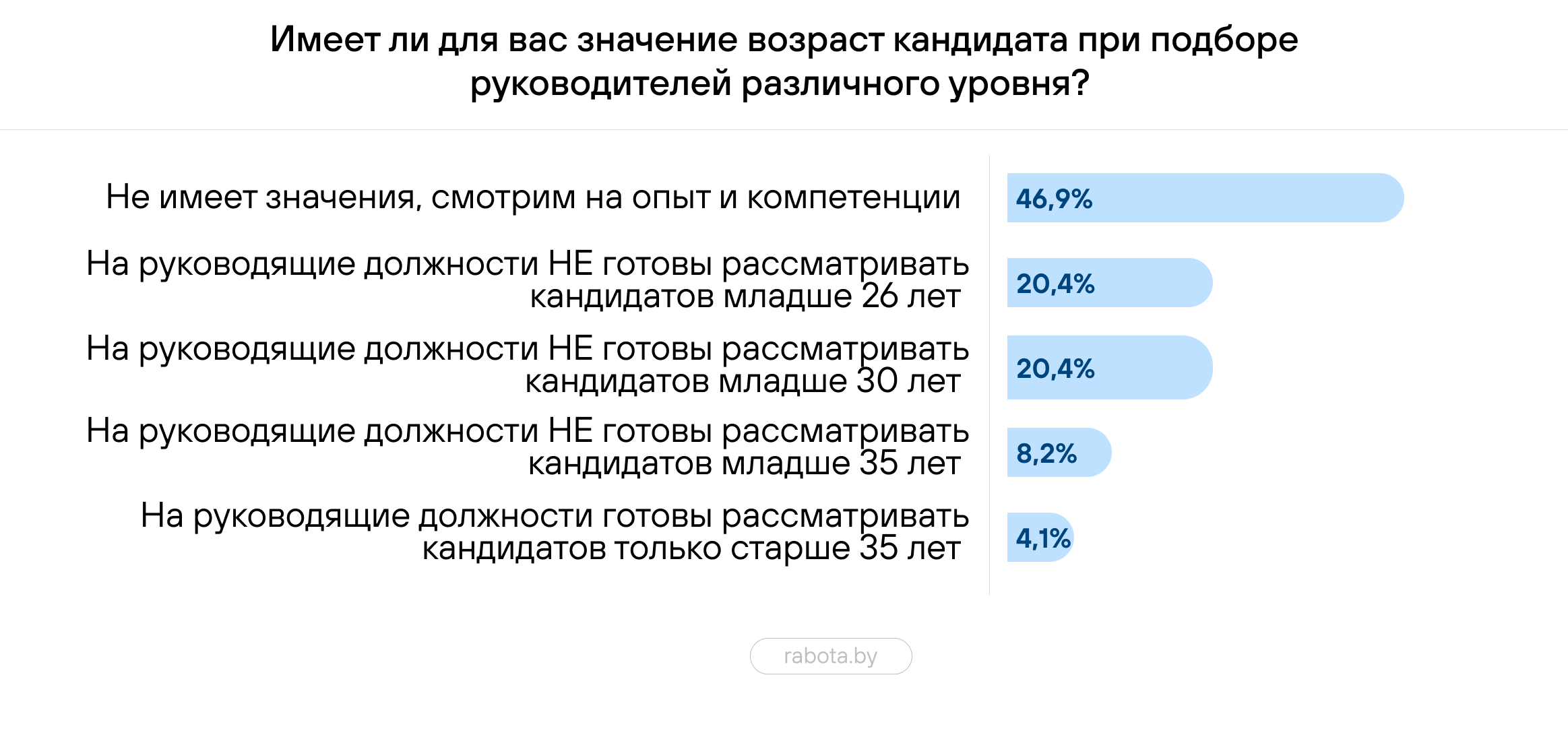 Дополнительно около 47% опрошенных нанимателей сообщили, что при подборе руководителей различного уровня возраст для них не имеет значения, и в первую очередь они оценивают опыт и компетенции.