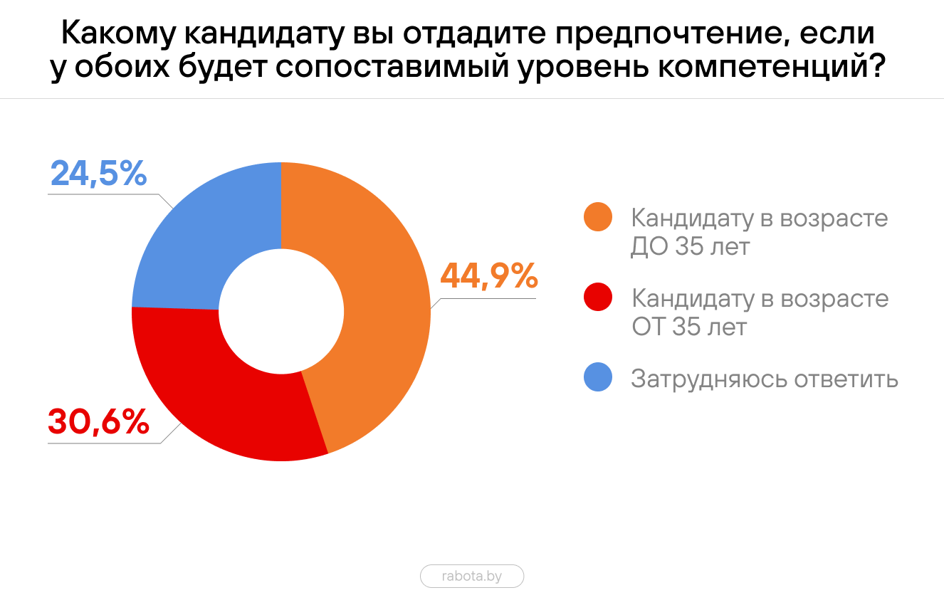 В то же время если опрошенных нанимателей поставить перед выбором между двумя кандидатами с сопоставимым уровнем компетенций, то около 45% выберут кандидата в возрасте до 35 лет.
