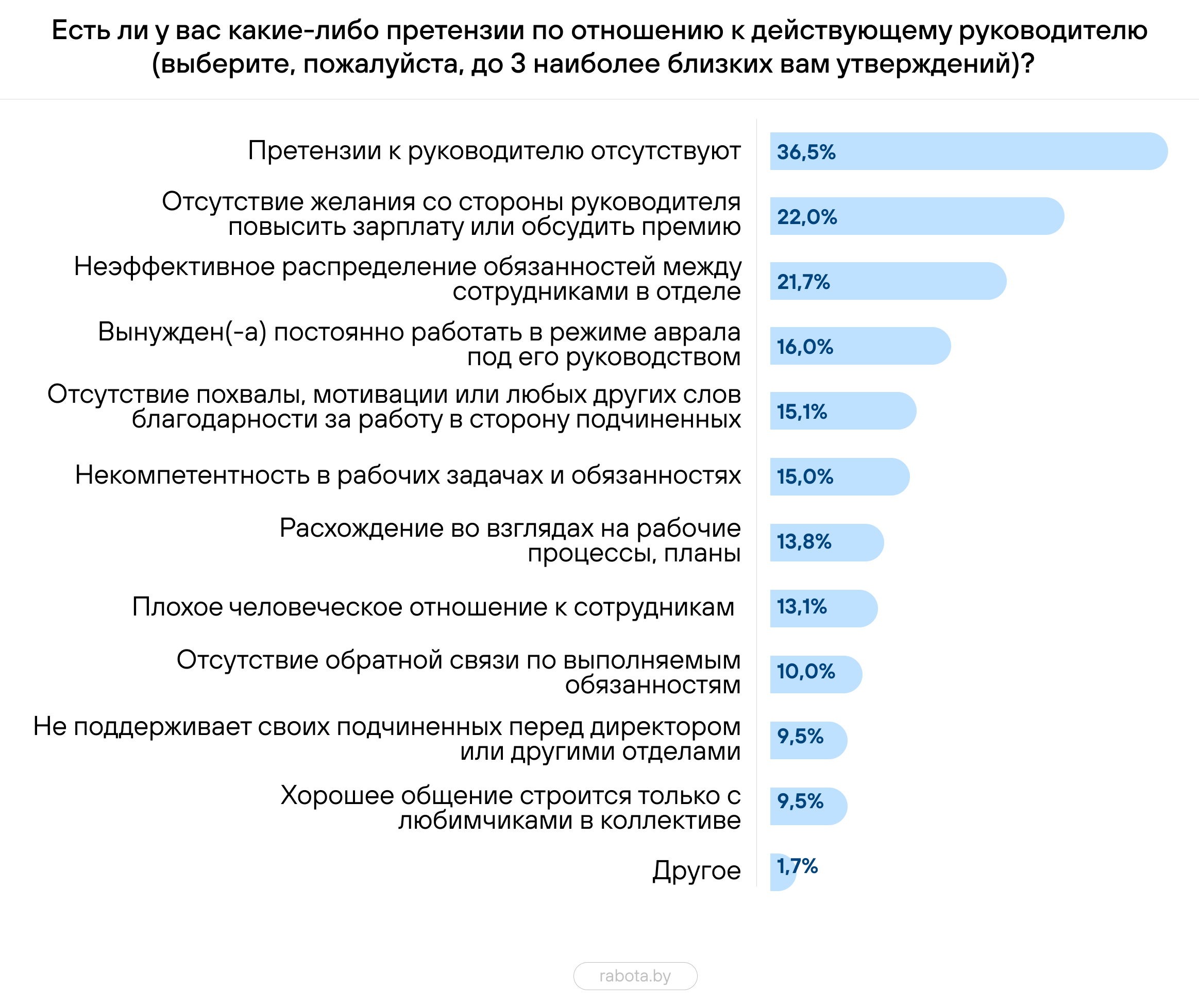 Вне зависимости от возраста текущего руководителя у многих специалистов назрели претензии к действующему начальству, только чуть более трети высказались за их отсутствие (36,5%). В тройку наиболее распространенных недовольств вошли: