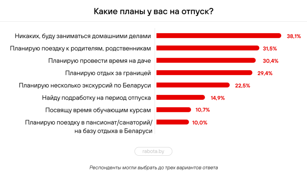 Исследовательский центр rabota.by провел опрос специалистов о планах, уже свершившихся или только намеченных, на лето. И выяснил, что уход в отпуск в июне-августе планировали только около 36% из них.