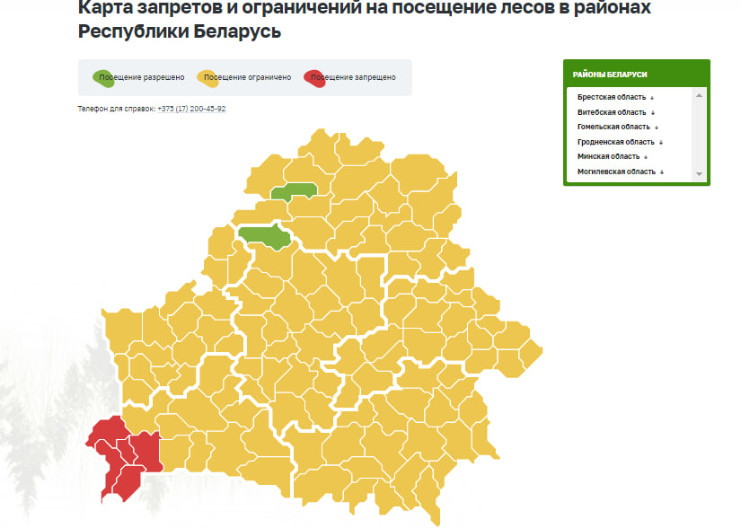 На данный момент в Беларуси введены запреты на посещение лесов в пяти районах, о чем свидетельствует интерактивная карта Министерства лесного хозяйства.